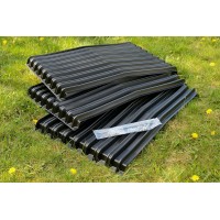 Die Größe des Abdeckelementes ist (L)114cm x (B)74cm x (H)14,5cm. Der Dachüberstand beträgt somit ca. 7 cm an den Seiten. Das Element lässt sich, wie Dachziegel am Rand überlappend, endlos aneinanderreihen. Ein Teil wird am nächsten befestigt. Das Material ist ein robustes HDPE Regenerat (Recycling) mit UV-Schutz.